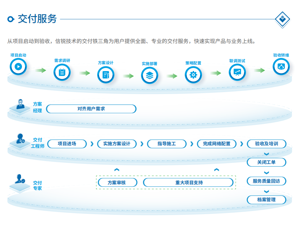 专业化的方案设计服务保障需求得到完美匹配;规范化的交付服务使得项目高质量有序落地;强大的售后保障团队使得项目运行无忧。信锐有着项目全流程的服务方案,通过对每个环节的把控,完美解决用户所有需求。