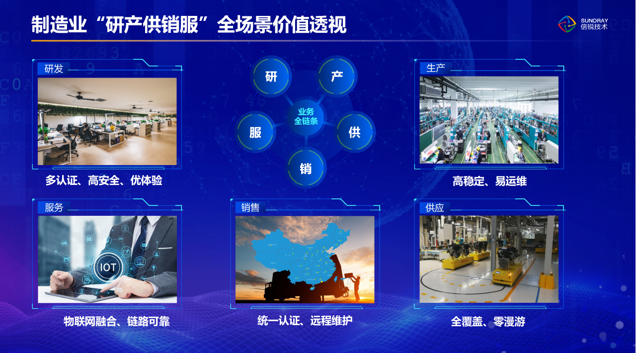 面对制造业网络的新挑战,信锐提出了AI自动驾驶网络的概念,并针对制造业“研产供销服”全链条(图七),从生产到研发,从服务到销售,提供了高稳定、易运维的网络环境,以及多认证、高安全、优体验的服务。